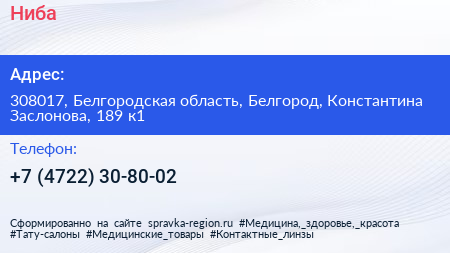 Ниба по адресу 308017, Белгородская область, Белгород, Константина Заслонова, 189 к1 в дальнейшем Организация, размещена в следующих категориях: