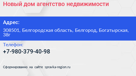 Новый дом, агентство недвижимости по адресу 308501, Белгородская область, Белгород, Богатырская, 38г в дальнейшем Организация, размещена в следующих категориях: