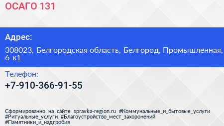 ОСАГО 131 по адресу 308023, Белгородская область, Белгород, Промышленная, 6 к1 в дальнейшем Организация, размещена в следующих категориях: