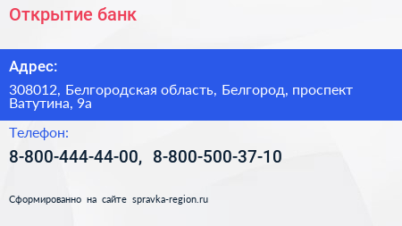 Открытие, банк по адресу 308012, Белгородская область, Белгород, проспект Ватутина, 9а в дальнейшем Организация, размещена в следующих категориях: