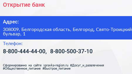 Открытие, банк по адресу 308009, Белгородская область, Белгород, Свято-Троицкий бульвар, 1 в дальнейшем Организация, размещена в следующих категориях: