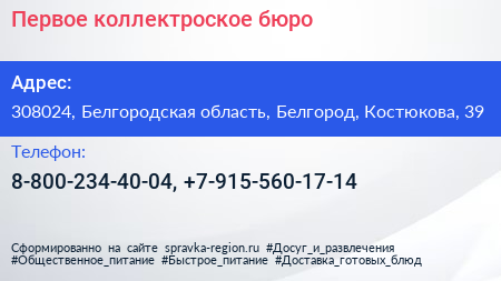 Первое коллектроское бюро по адресу 308024, Белгородская область, Белгород, Костюкова, 39 в дальнейшем Организация, размещена в следующих категориях: