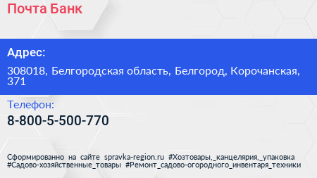 Почта Банк по адресу 308018, Белгородская область, Белгород, Корочанская, 371 в дальнейшем Организация, размещена в следующих категориях: