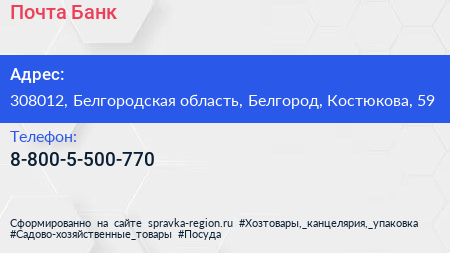 Почта Банк по адресу 308012, Белгородская область, Белгород, Костюкова, 59 в дальнейшем Организация, размещена в следующих категориях: