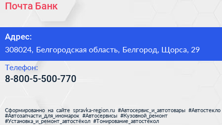 Почта Банк по адресу 308024, Белгородская область, Белгород, Щорса, 29 в дальнейшем Организация, размещена в следующих категориях: