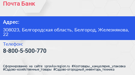 Почта Банк по адресу 308023, Белгородская область, Белгород, Железнякова, 22 в дальнейшем Организация, размещена в следующих категориях: