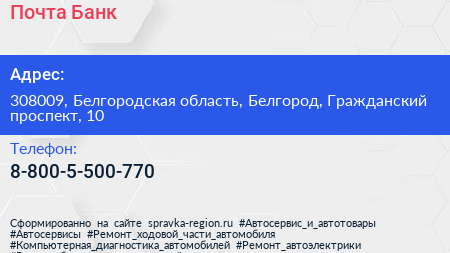 Почта Банк по адресу 308009, Белгородская область, Белгород, Гражданский проспект, 10 в дальнейшем Организация, размещена в следующих категориях: