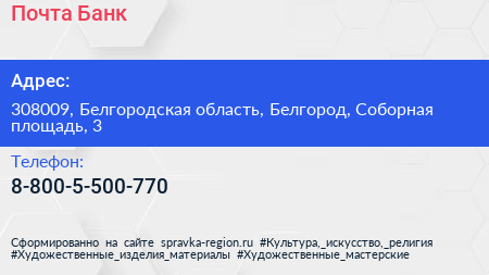 Почта Банк по адресу 308009, Белгородская область, Белгород, Соборная площадь, 3 в дальнейшем Организация, размещена в следующих категориях: