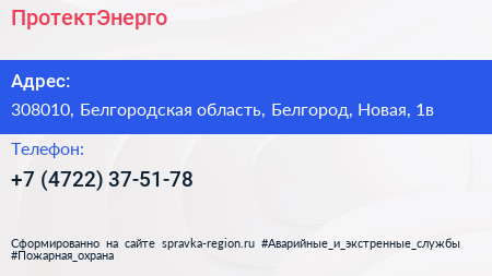 ПротектЭнерго по адресу 308010, Белгородская область, Белгород, Новая, 1в в дальнейшем Организация, размещена в следующих категориях: