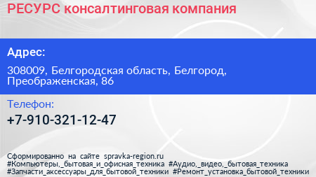 РЕСУРС, консалтинговая компания по адресу 308009, Белгородская область, Белгород, Преображенская, 86 в дальнейшем Организация, размещена в следующих категориях: