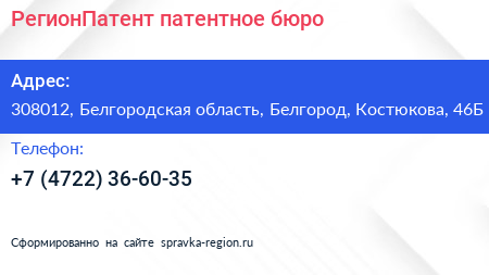 РегионПатент, патентное бюро по адресу 308012, Белгородская область, Белгород, Костюкова, 46Б в дальнейшем Организация, размещена в следующих категориях: