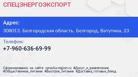 СПЕЦЭНЕРГОЭКСПОРТ по адресу 308013, Белгородская область, Белгород, Ватутина, 23 в дальнейшем Организация, размещена в следующих категориях: