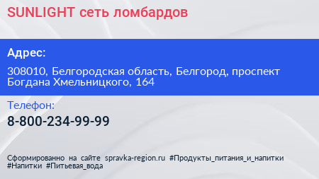 SUNLIGHT, сеть ломбардов по адресу 308010, Белгородская область, Белгород, проспект Богдана Хмельницкого, 164 в дальнейшем Организация, размещена в следующих категориях: