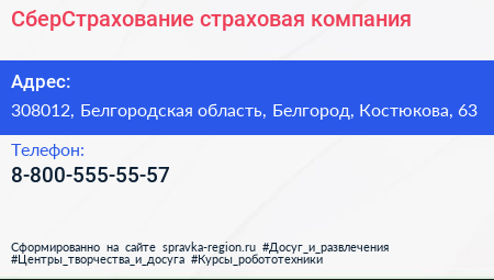 СберСтрахование, страховая компания по адресу 308012, Белгородская область, Белгород, Костюкова, 63 в дальнейшем Организация, размещена в следующих категориях:
