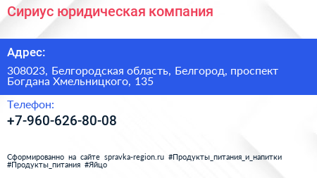 Сириус, юридическая компания по адресу 308023, Белгородская область, Белгород, проспект Богдана Хмельницкого, 135 в дальнейшем Организация, размещена в следующих категориях: