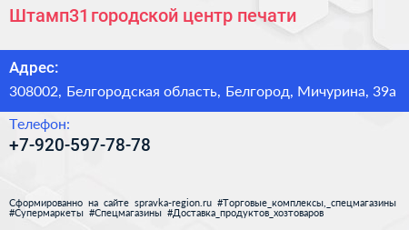 Штамп31, городской центр печати по адресу 308002, Белгородская область, Белгород, Мичурина, 39а в дальнейшем Организация, размещена в следующих категориях: