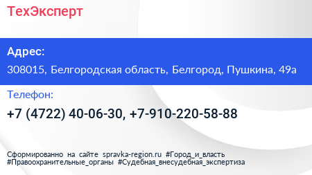 ТехЭксперт по адресу 308015, Белгородская область, Белгород, Пушкина, 49а в дальнейшем Организация, размещена в следующих категориях: