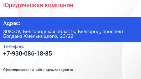 Юридическая компания по адресу 308009, Белгородская область, Белгород, проспект Богдана Хмельницкого, 20/22 в дальнейшем Организация, размещена в следующих категориях: