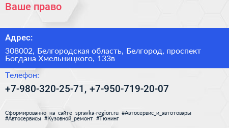 Ваше право по адресу 308002, Белгородская область, Белгород, проспект Богдана Хмельницкого, 133в в дальнейшем Организация, размещена в следующих категориях: