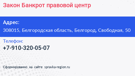 Закон & Банкрот, правовой центр по адресу 308015, Белгородская область, Белгород, Свободная, 50 в дальнейшем Организация, размещена в следующих категориях: