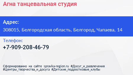 Агна, танцевальная студия по адресу 308015, Белгородская область, Белгород, Чапаева, 14 в дальнейшем Организация, размещена в следующих категориях: