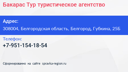 Бакарас-Тур, туристическое агентство по адресу 308004, Белгородская область, Белгород, Губкина, 25Б в дальнейшем Организация, размещена в следующих категориях: