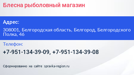 Блесна, рыболовный магазин по адресу 308001, Белгородская область, Белгород, Белгородского Полка, 46 в дальнейшем Организация, размещена в следующих категориях: