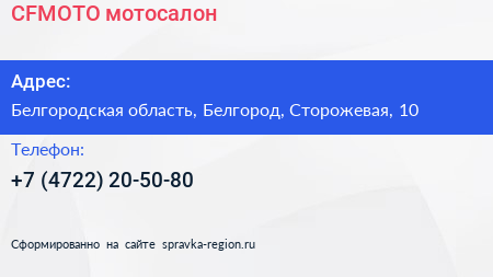 CFMOTO, мотосалон по адресу Белгородская область, Белгород, Сторожевая, 10 в дальнейшем Организация, размещена в следующих категориях: