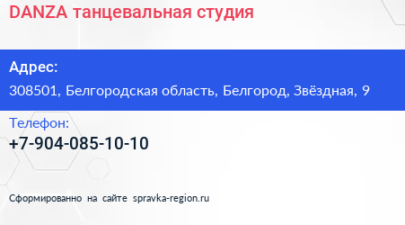 DANZA, танцевальная студия по адресу 308501, Белгородская область, Белгород, Звёздная, 9 в дальнейшем Организация, размещена в следующих категориях: