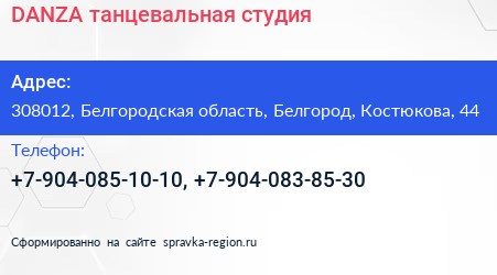 DANZA, танцевальная студия по адресу 308012, Белгородская область, Белгород, Костюкова, 44 в дальнейшем Организация, размещена в следующих категориях: