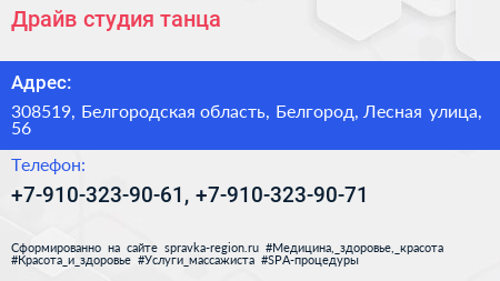 Драйв, студия танца по адресу 308519, Белгородская область, Белгород, Лесная улица, 56 в дальнейшем Организация, размещена в следующих категориях:
