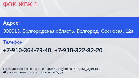 ФОК ЖБК-1 по адресу 308013, Белгородская область, Белгород, Сосновая, 12а в дальнейшем Организация, размещена в следующих категориях:
