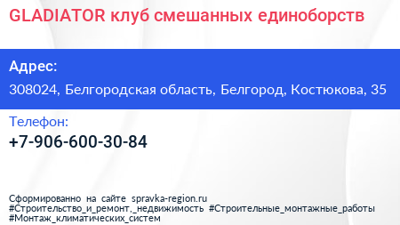 GLADIATOR, клуб смешанных единоборств по адресу 308024, Белгородская область, Белгород, Костюкова, 35 в дальнейшем Организация, размещена в следующих категориях: