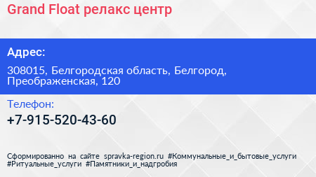 Grand Float, релакс-центр по адресу 308015, Белгородская область, Белгород, Преображенская, 120 в дальнейшем Организация, размещена в следующих категориях: