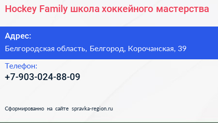Hockey Family, школа хоккейного мастерства по адресу Белгородская область, Белгород, Корочанская, 39 в дальнейшем Организация, размещена в следующих категориях: