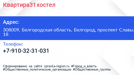 Квартира31, хостел по адресу 308009, Белгородская область, Белгород, проспект Славы, 18 в дальнейшем Организация, размещена в следующих категориях: