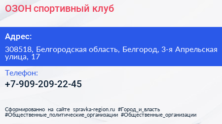 ОЗОН, спортивный клуб по адресу 308518, Белгородская область, Белгород, 3-я Апрельская улица, 17 в дальнейшем Организация, размещена в следующих категориях: