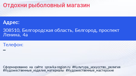 Отдохни, рыболовный магазин по адресу 308510, Белгородская область, Белгород, проспект Ленина, 4а в дальнейшем Организация, размещена в следующих категориях:
