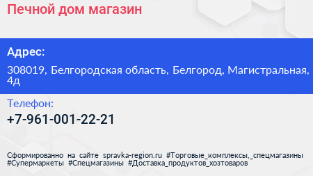 Печной дом, магазин по адресу 308019, Белгородская область, Белгород, Магистральная, 4д в дальнейшем Организация, размещена в следующих категориях: