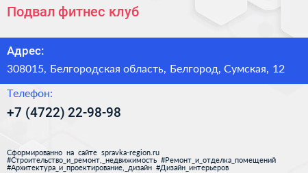 Подвал, фитнес-клуб по адресу 308015, Белгородская область, Белгород, Сумская, 12 в дальнейшем Организация, размещена в следующих категориях: