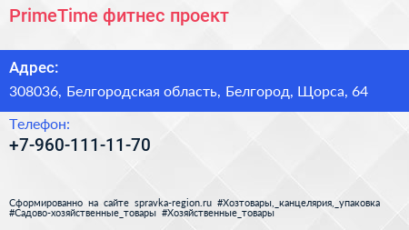 PrimeTime, фитнес-проект по адресу 308036, Белгородская область, Белгород, Щорса, 64 в дальнейшем Организация, размещена в следующих категориях: