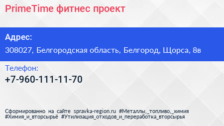 PrimeTime, фитнес-проект по адресу 308027, Белгородская область, Белгород, Щорса, 8в в дальнейшем Организация, размещена в следующих категориях:
