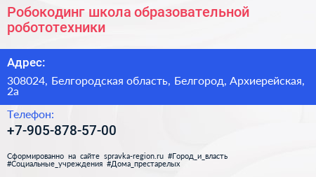 Робокодинг, школа образовательной робототехники по адресу 308024, Белгородская область, Белгород, Архиерейская, 2а в дальнейшем Организация, размещена в следующих категориях: