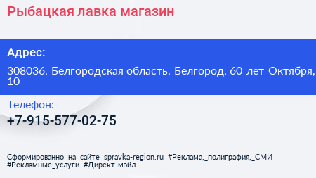 Рыбацкая лавка, магазин по адресу 308036, Белгородская область, Белгород, 60 лет Октября, 10 в дальнейшем Организация, размещена в следующих категориях: