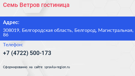 Семь Ветров, гостиница по адресу 308019, Белгородская область, Белгород, Магистральная, 86 в дальнейшем Организация, размещена в следующих категориях: