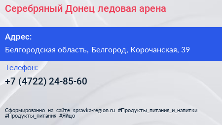 Серебряный Донец, ледовая арена по адресу Белгородская область, Белгород, Корочанская, 39 в дальнейшем Организация, размещена в следующих категориях:
