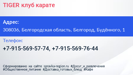 TIGER, клуб карате по адресу 308036, Белгородская область, Белгород, Будённого, 1 в дальнейшем Организация, размещена в следующих категориях: