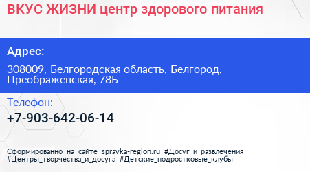 ВКУС ЖИЗНИ, центр здорового питания по адресу 308009, Белгородская область, Белгород, Преображенская, 78Б в дальнейшем Организация, размещена в следующих категориях: