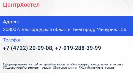 ЦентрХостел по адресу 308007, Белгородская область, Белгород, Мичурина, 56 в дальнейшем Организация, размещена в следующих категориях: