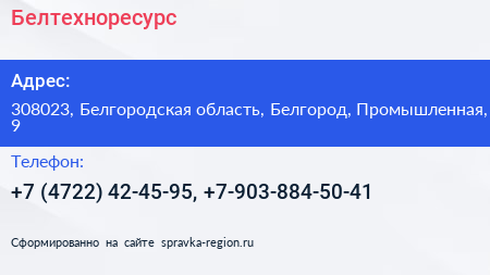 Белтехноресурс по адресу 308023, Белгородская область, Белгород, Промышленная, 9 в дальнейшем Организация, размещена в следующих категориях: